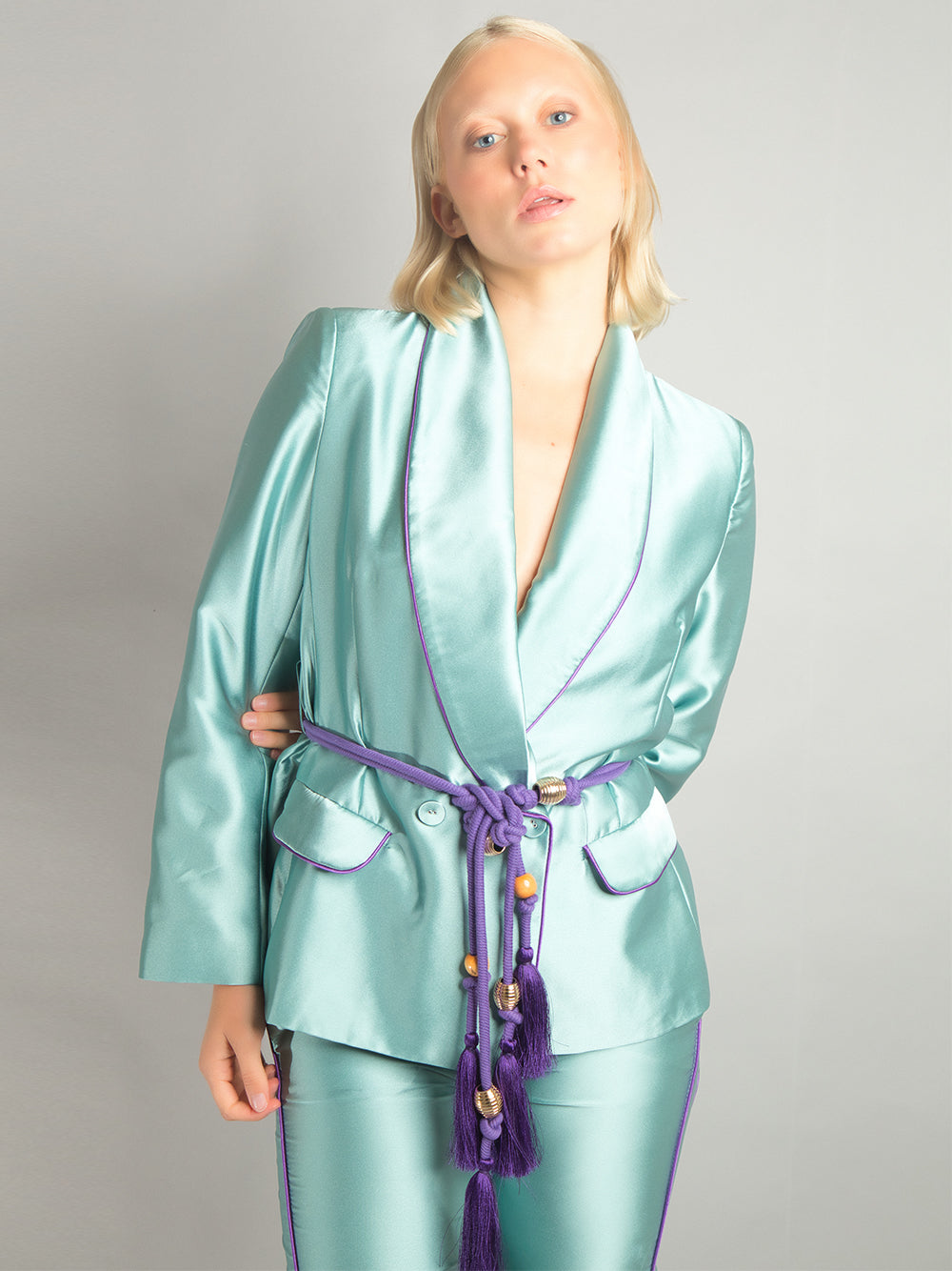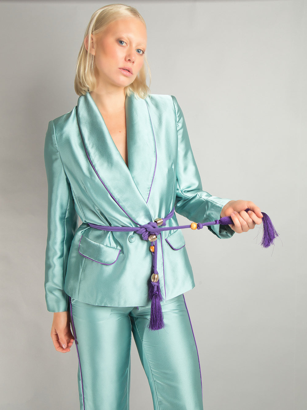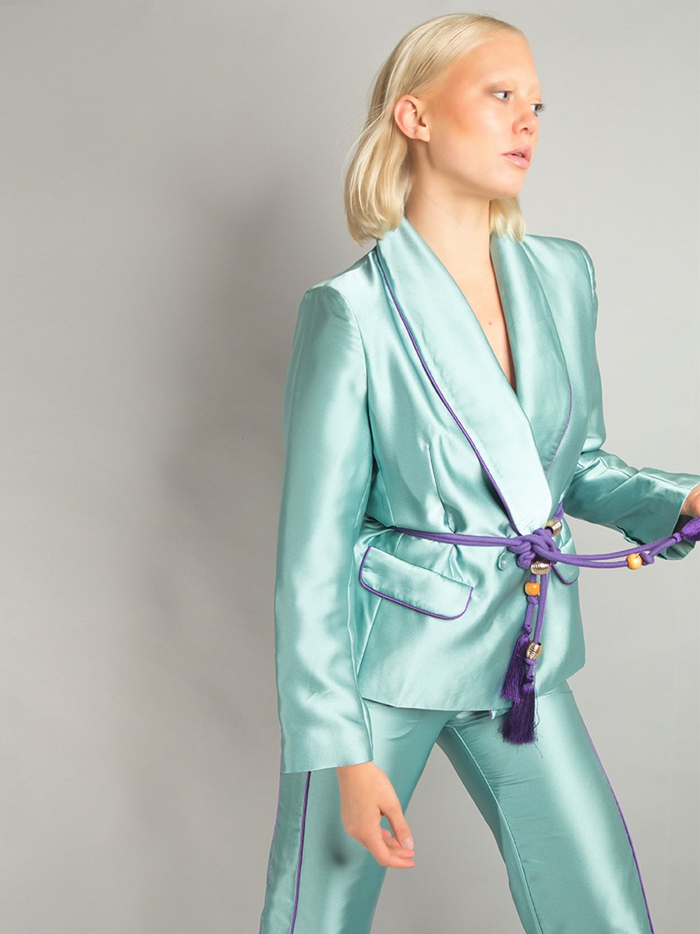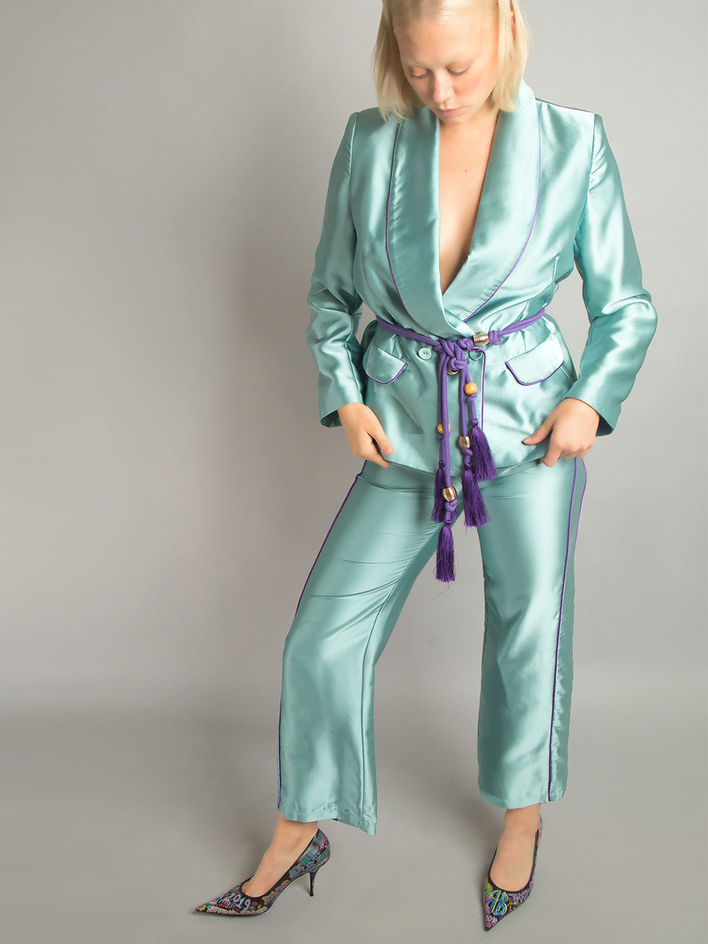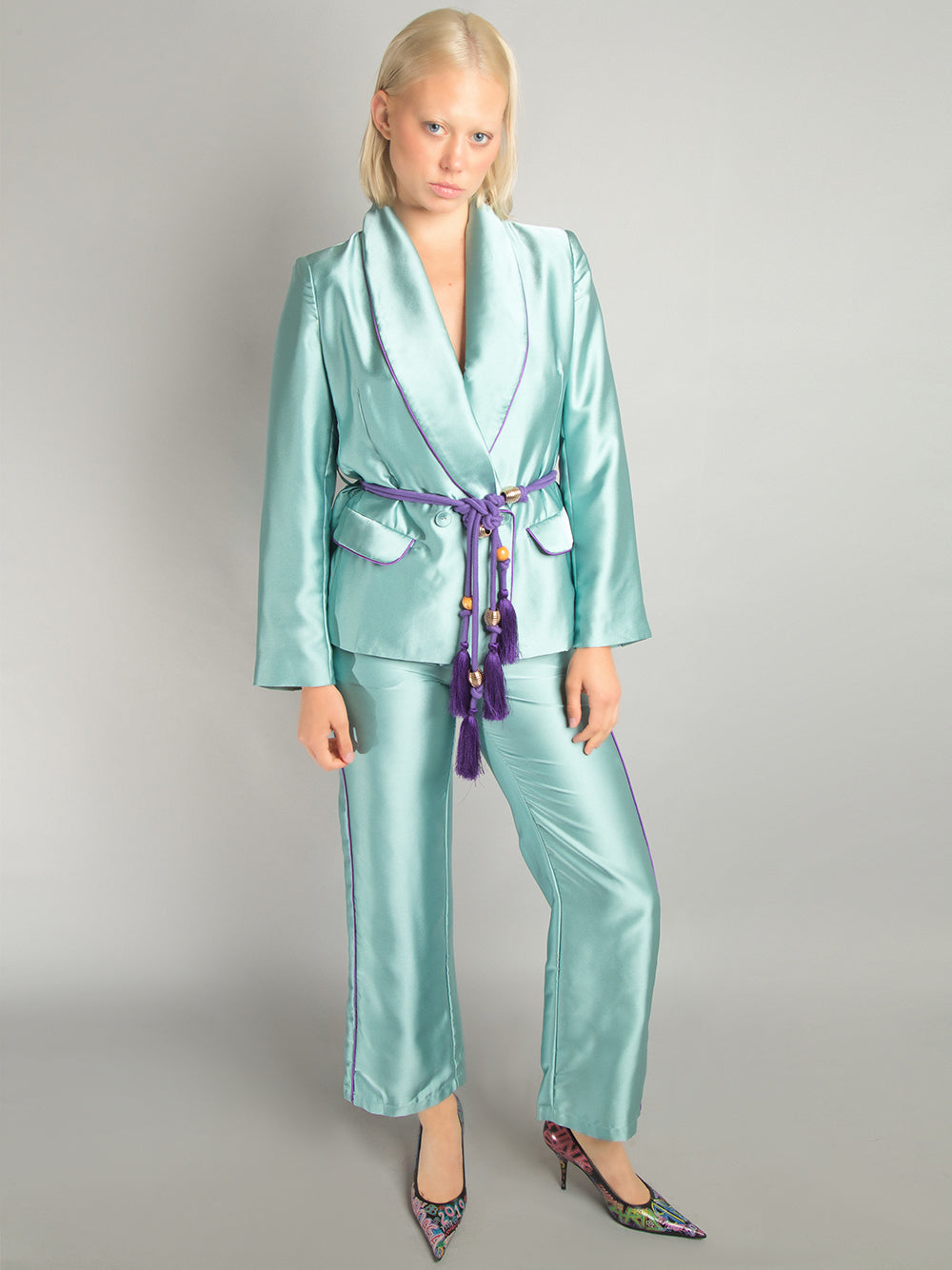 - Style № ZC_NYC23_PJ Satin Blazer + Pants Matching Set in Turquoise