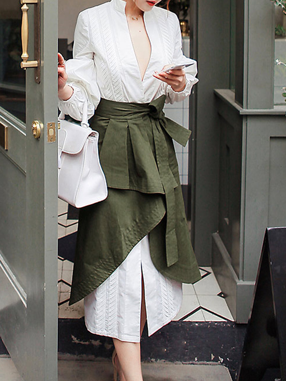 - Puff-Sleeved Dress & High-Waist Lace-Up Ruched Irregular Skirt – 2 Pieces Matching Set